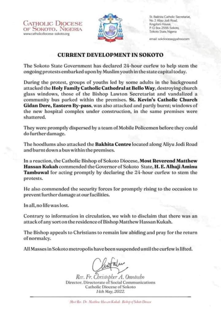 He wrote, “I must take out time to join Father Kukah in commending Sokoto State Governor, Tambuwal for doing everything to protect Christians in the state after the satanic acts of some extremists. This letter by Father Kukah is how leaders should speak.”