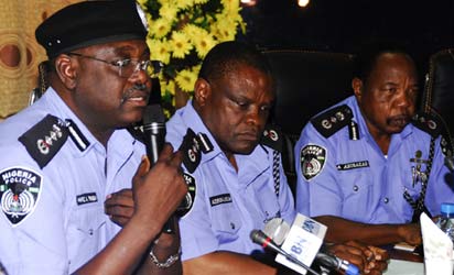 BRIEFING—From left: Inspector General of Police, Hafiz Ringim, DIG Azubuko Udah and DIG Abubakar addressing newsmen on the recent bomb blast at Police Headquarters, Abuja, yesterday. Photo: Gbemiga Olamikan.