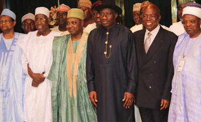 President Goodluck Jonathan flanked by the Chairman Arewa Consultative Forum, Lt. Gen Jerry Useni and Vice President Namadi Sambo (2l) while others watched during a meeting with the Presidency and the Northern Leaders at the State House, Abuja. Photo by Abayomi Adeshida