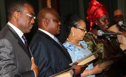 From left: Dr. Akinwumi Adesina; Ezenwo Nyesom Wike; Ms. Amal Pepple and Mrs. Sarah Reng Ochekpe taking the oath of office as Ministers before President Goodluck Jonathan at the Presidential Villa, Abuja. Photo by Abayomi Adeshida