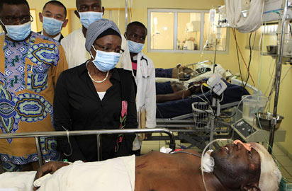 UN DEPUTY SCRIBE VISITS VICTIMS —United Nations Deputy Secretary-General Asha-Rose Migiro (R) with to a man injured in the August 27 suicide attack on the United Nations House in Abuja, as she visits victims of the blast in the intensive care unit of the National Hospital in Abuja yesterday. Photo: AFP