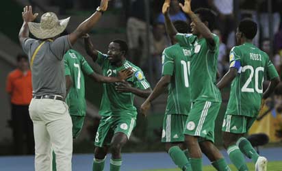 COLOMBIA, Armenia : Nigeria’s Edafe Egbedi (C) and coach Jonh Obuh (L) celebrate after scoring against England during their FIFA World Cup U20 football match held at Centenario stadium in Armenia, Quindio department, Colombia on August 10, 2011. AFP PHOTO