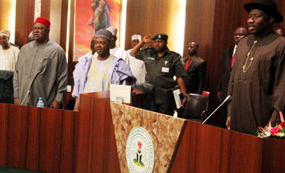 From the right, President Goodluck Jonathan; Vice President Namadi Sambo; SGF, Senator Pius Anyim; Head of Service, sinning the National Anthem at the opening of the periodic meeting of the Federal Executive Council at the State House, Abuja. Photo by Abayomi Adeshida 19/10/2011