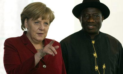German Chancellor Angela Merkel (L) and Nigeria's President Goodluck Jonathan arrive for a press conference following talks at the chancellery in Berlin April 19, 2012. AFP PHOTO
