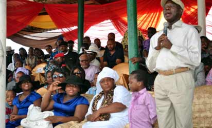 Mr. Adams Oshiomole, delivering his speech. With him are the widow of the deceased, Mrs Labake Oyerinde and her children, in Ede.