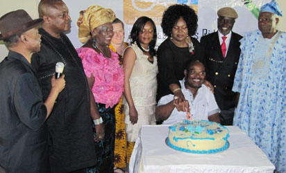 Uncle Sam Amuka, Oliver Akubueze, Chief (Mrs.) Kate Onunwa, Marij Colruyt, Mrs. Josephine Nzerem, Mrs. Azuka Okoli, Mr. Cosmas Okoli, Senator Bode Olajumoke and Elder S. E. Ishelowo in a group photograph with Mr. Okoli as he cuts his birthday cake at Golden Tulip Hotel, Festac Town, Lagos.