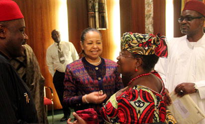 - Finance Minister, Mrs. Ngozi Okonjo-Iweala discussing with the Health Minister, Dr. Christian Chukwu (l); Housing Minister, Ms. Amal Pepple and the Solid Minerals Development Minister, Arc. Musa Sada during the weekly meeting of the Federal Executive Council at the State House, Abuja. Photo by Abayomi Adeshida