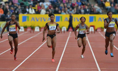 Jamaica’s Shelly-Ann Fraser-Pryce (2R) in the women’s 100m final on the second day of the 2012 Diamond League athletics meet at Crystal Palace in London on July 14, 2012. Okagbare won, Jeter placed secon, Madison third and Fraser-Pryce last. AFP PHOTO