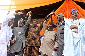 *L-r: Afenifere leader, Chief Reuben Fasoranti; founder, OPC, Dr Frederick Faseun; Ondo State Governor, Dr Olusegun Mimiko; Chief Ayo Adebanjo, Dr Kunle Olajide and Chief Olu Falae at the declaration for 2nd term of Mimiko, at the Democracy Park, in Akure, yesterday. Photo: Joe Akintola.