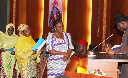 SIGNING OF PERFORMANCE DOCUMENT—President Goodluck Jonathan (right), flanked by Water Resources Minister, Mrs Sarah Ochekpe; Women Affairs Minister, Hajiya Zainab Maina and Education Minister, Prof. Ruqqayat Rufai during the signing of performance agreement and contracting system document at the State House, Abuja, recently . Photo: Abayomi Adeshida.