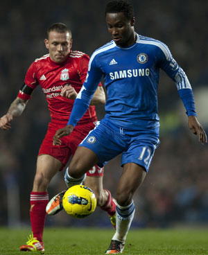 Midfielder John Mikel Obi (R) vies for the ball against Liverpool’s Craig Bellamy (L) during an English Premier League match