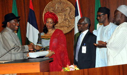 From left: President Jonathan, Minister of Petroleum Deziani Allison-Maduake, Mr. Dotun Suleiman, Chairman, Special Task Forces on Governance and Control; Mallam Nuhu Ribadu, Chairman Petroleum Revenue Special Tsks Force and Alternate Chairman, Refineries Special Task Force, Alhaji Yusuf Alli during the presentation of reports of the Petroleum Special Tasks Forces at the Presidential Villa, Abuja .