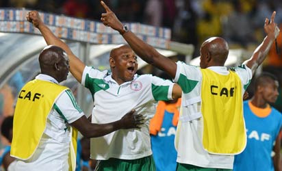 Nigeria’s head coach Stephen Keshi (C) celebrates at the end of the African Cup of Nation 2013 quarter final football match Ivory Coast vs Nigeria, on February 3, 2013 in Rustenburg. Nigeria won 2-1. AFP PHOTO