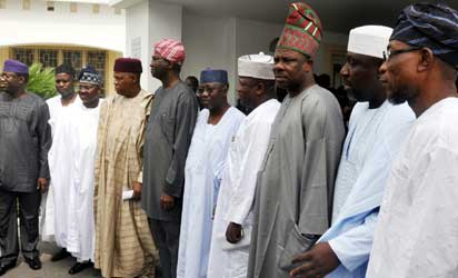 OPPOSITION—From right: Gov Kayode Fayemi (Ekiti); representative of Yobe State Governor, Senator Jejere Alkali; Govs Abiola Ajimobi (Oyo); Kashim Shettima (Borno); Babatunde Fashola (Lagos); Umar Tanko Al -Makura (Nasarawa); Abdul-Aziz Yari (Zamfara); Ibikunle Amosun (Ogun); Rochas Okorocha (Imo) and Rauf Aregbesola (Osun), after the meeting of Opposition Governors on the proposed merger, held at Lagos House Marina, yesterday. Photo: Bunmi Azeez.