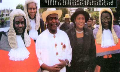 From left: Chief Judge of Rivers State, Justice Iche Ndu, the Attorney General and Commissioner for Justice, Mr. Odein Ajumogobia, SAN; Governor Peter Odili and his wife, Mary, and Justice Elizabeth Membere shortly after a special court session at the High Court Complex, Port Harcourt