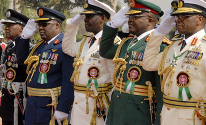The Chief of Defence Staff, Admiral Ola Ibrahim, other Service Chiefs and the Inspector General of Police, taking the salute during the Wreath Laying Ceremony to mark the 2013 Nigerian Armed Forces Remembrance Day celebration at the Cenotaph, Eagle Square, Abuja, yesterday. Photo:Abayomi Adeshida