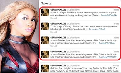 Why won’t they let Goldie rest in peace? The star seems to be more controversial from the great beyond than when she was alive and well. And it keeps getting more colourful. It appears that some unidentified individual has taken the reins of the deceased pop singer’s tweeter account and is using it as a publicity platform to promote Nigerian movies as well as Tonto Dikeh’s ‘hit’ (popularly bashed and generally unaccepted) single Jeje.