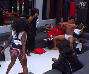 What started off as an innocent dance off; soon things took a turn for wild when it was Bassey and Beverly’s turn to hit the floor. As the Nigerian gyrated all over him, the Sierra Leonean stripped down to his tight white briefs and he returned the favour – shaking and grinding all over the Ruby lass. Wowza! The rest of the Housemates clearly enjoy this raunchy performance as they cheered them on.