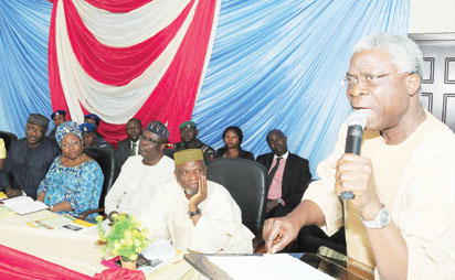 From left: Governor Kayode Fayemi of Ekiti; wife, Erelu Bisi; Babafemi Ojudu, Senator representing Ekiti Central, Prof. Sola Adeyeye , Osun Central Senatorial District and Prof. Niyi Osundare delivering his Keynote address during the opening of the first Ikogosi Graduate Summer School, at Ikogosi Warm Spring Resort, Ekiti State.
