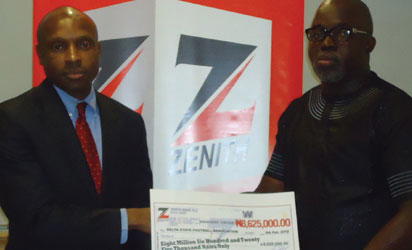CHEQUE PRESENTATION…Delta FA Chairman, Pinnick Amaju (r) receives cheque from Etoh John Lucky Zenith Bank Plc .