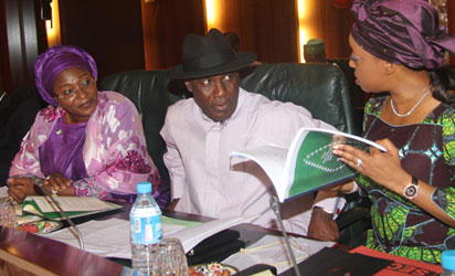 Petroleum Resources Minister, Mrs. Deziani Alison-Madueke (r) showing a copy of the authentic Petroleum Industry Bill to the Niger Delta Minister, Elder Godsday Orubebe and the Minister of State Niger DeltaDevelopment, Hajia Zainab Kuchi while the Sports Minister, Mr. Bolaji Abdullahi watched the weekly meeting of the Federal Executive Council at the State House, Abuja. Photo by Abayomi Adeshida