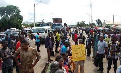 The physically challenged persons during the protest, yesterday. PHOTO: NATH ONOJAKE