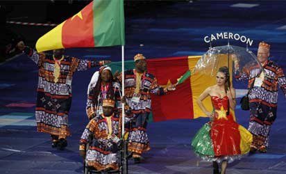 Cameroon’s flagbearer leads his delegation as they parade during the opening ceremony of the London 2012 Paralympic Games at the Olympic Stadium in east London on August 29, 2012. AFP PHOTO