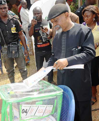 APC GOVERNORSHIP CANDIDATE, SEN. CHRIS NGIGE CASTING HIS VOTE DURING ANAMBRA GOVERNORSHIP ELECTION AT ALOR WARD OF IDEMILI SOUTH LOCAL GOVERNMENT AREA OF ANAMBRA STATE ON SATURDAY (16/11/13).