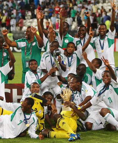 UNITED ARAB EMIRATES, Abu Dhabi : Nigerian players celebrate with their trophy after they won the FIFA U-17 World Cup 2013 at Mohammed bin Zayed Stadium, on November 8, 2013 in Abu Dhabi, UAE. Nigeria won the final against Mexico 3-0. AFP PHOTO