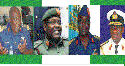 Badeh, Defence Chief; Minimah, Army Chief; Amosu, Airforce Chief and Jibrin, Naval Chief