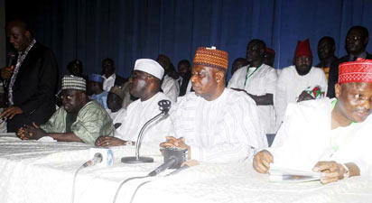 *New PDP: From Left, Rivers State Governor Rotimi Amechi , Niger State Governor Aliyu Babangida , Former Vice President Atiku Abubakar , New PDP Factional National Chairman Abubakar Kawu Baraje, Kano State Governor Rabiu Kawankwazo at Press conference announcing new PDP Factional Leadership in Abuja. Photo by Gbemiga Olamikan.