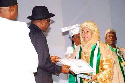 Jonathan hands to late Gen Sani Abacha’s widow, Mariam Abacha the centenary award . Source: Goodluck Jonathan FB wall