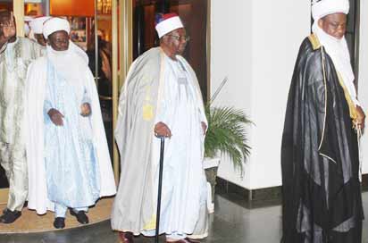CONSULTATION—Sultan of Sokoto, Alhaji Sa’ad Abubakar III (right) and some traditional rulers from the North after holding consultations with President Goodluck Jonathan at the First Lady’s Conference Hall, Aso Villa, Abuja on Monday. Photo: Abayomi Adeshida.