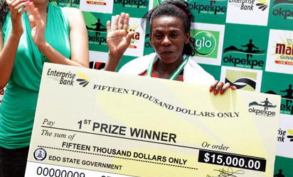 Winner of the First prize in the female category of the 10km Okpekpe race, Mudi Ayila of Ethipia, with time of 32.41 displays her dummy cheque at the 2nd edition of the 10km Okpekpe race in Edo State, yesterday.