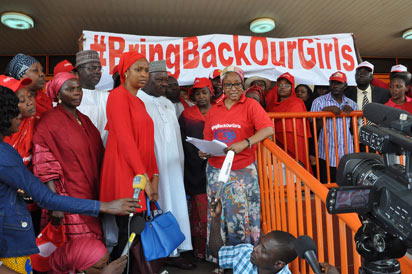 Chibiok Girls : Mrs. Maryam Uwais addressing newsmen and Abuja Family members of #Bringbackourgirls shortly after filing a suit against FCT Commissioner of Police who banned rallies in Abuja. Photo: Gbemiga Olamikan.