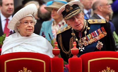 Britain’s Queen Elizabeth (L) and Prince Philip, Duke of Edinburgh, standing onboard the Spirit of Chartwell during the Thames Diamond Jubilee Pageant on the River Thames in London. Prince Philip, Queen Elizabeth II’s 90-year-old husband, was hospitalised June 4, 2012 with a bladder infection and will miss the rest of her diamond jubilee celebrations, Buckingham Palace said. AFP PHOTO