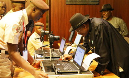 Standard Int’l Passport —President Goodluck Jonathan registers for the 64-Page Standard International Passport by the Nigeria Immigration Service at the State House, Abuja, yesterday. Photo: Abayomi Adeshida.