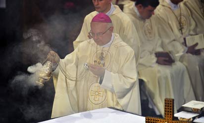 Archbishop of Freiburg, Robert Zollitsch waves incense during a mass service to mark the resignation of Pope Benedict XVI at the St. Hedwig’s Cathedral in Berlin on February 28, 2013. The mass coincides with the final hour of Benedict XVI papacy as his powers formally expire at 19:00 GMT. AFP PHOTO