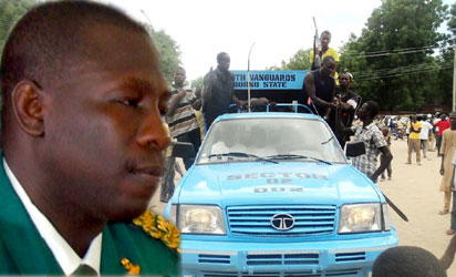 INSECURITY—Right: Members of local vigilante called Civilian Jtf on  patrol in Maiduguri, Borno State, yesterday.  Left: Lt. Col. Adeboye Obasanjo. Photos: NAN/Sahara Reporters.