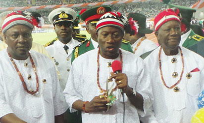 AKWA IBOM STADIUM President of Ghana John Mahama, President Goodluck Jonathan, and President of Cote D’lvoire Alhassan Ouattarra during the commissioning ceremony of the 30,000 Capacity Akwa Ibom International Stadium, held in Uyo, Akwa Ibom State. Photo by Abayomi Adeshida