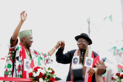 Nigerian President Goodluck Jonathan (R) and Nigerian Vice President Namadi Sambo greet supporters at a ceremony in Abuja on November 11, 2014. Nigeria’s President Goodluck Jonathan on November 11 declared his bid for re-election, vowing to finally defeat Boko Haram whose rise in strength during his first term has threatened the country’s sovereignty. The 56-year-old made the announcement to tens of thousands of supporters in the red, white and green of his ruling Peoples Democratic Party (PDP), at a carefully orchestrated ceremony including patriotic music, dancing, prayers and speeches. AFP PHOTO