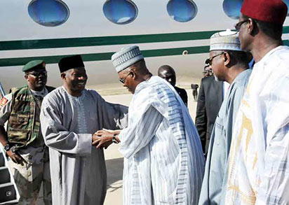 From the airport, Jonathan was driven straight to Maimalari Barracks amid tight security, where he addressed the troops. All roads leading to the airport from the city were closed for motorists.
