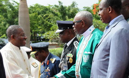 President Goodluck Jonathan (2nd L) being received by the President, Christian Association Of Nigeria (CAN) Pastor Ayo Oritsejafor at the 2014 Democracy Day Interdenominational Church Service in Abuja on Sunday (25/5/14). With Them Are: Executive Secretary Nigeria Christian Pilgrims Commission, Mr Johnkennedy Opara (L) and former Chaplain, Aso Villa Chapel, Pastor Williams Okoye.