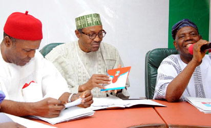 APC NEC Meeting : Interim National Chairman ,All Progressives Congress (APC) , Chief Bisi Akande (right), Former Head of State , Muhammadu Buhari (middle) and a Party Chieftain , Ogbonaya Onu during the National Executive Council meeting of All Progressives Congress (APC) at the National Secretariat of the party in Abuja on Tuesday. Photo by Gbemiga Olamikan.