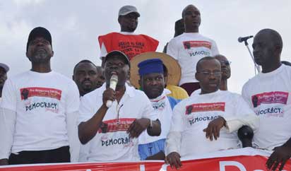•From left: Com. Malachy Ugwummadu, Com Lanre Suraju, Coordinator of Nigerians United for Democracy, Mr. Femi Falana, Mr. Jiti Ogunye, Mr. Onyekachi Ubani, former Chairman, Nigeria Bar association[NBA] Ikeja branch, Com. Sina Odugbemi, member of National coalition for democracy, at the rally. Photo: Bunmi Azeez