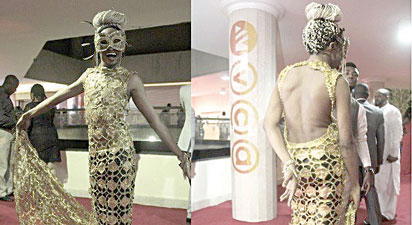 At AMVCA 2015 he nearly got people scurrying for cover when he arrived the scene looking like Ojuju Calabar in his gold net dress with a pair of leather pants underneath the dress and accessorized with a gold mask and a pair of gold boots. The oddity of it all is that Denrele had his entire backline gaping out of the dress and there was nothing macho about it. In fact a back view of Denrele would have got some dudes thinking they have a damsel looking for trouble in view. Or was he actually looking for trouble? Because all that could be seen of his masculinity was his feminine side screaming out to be heard.