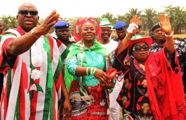 From Left: Ekiti State Governor, Mr. Ayodele Fayose; Wife of the Ekiti State Governor, Mrs. Feyisetan Fayose and the Wife of the President, Dame Patience Jonathan acknowledging the cheer during the PDP Women Rally in support of the 2nd term of President Goodluck Jonathan in Ado-Ekiti on Monday….Photo. Government House Ekiti.