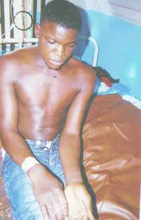 They tied me to their Hilux van. This man who shot me went into the Hilux and brought out his gun. He shot me with the gun and dropped it. He said he will tell me that he is an Igarra man, that he will kill me and nothing will happen. His colleagues were blaming him for shooting me. The man said I looked like the boy who assaulted them when they came to my village to arrest some body. I am from Ullushi main town in Esan South East. When they were blaming him, he now threw the handcuff key to others that they should remove the handcuff; that was how they took me to hospital.