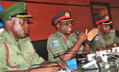 Public Relations Officer, Office of the Chief of Army Staff, Lt.-Col. Aminu Iliyasu; Director, Army Public Relations, Brig.-Gen. Olajide Laleye and Chief of Staff, Directorate Of Army Public Relations, at a News Conference on Army Officers Conference in Abuja on Friday