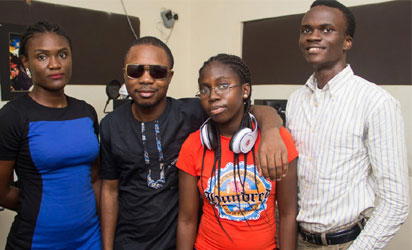 L-R: Sopulu Amaechina, Managing Editor, Vanguard Spark; Fliptyce, the Spark B.O.S.S.; ‘Tola Alawiye, Vanguard Spark Rookie for January; and ‘Tobi Solarin, Head Strategy and Planning, Vanguard Spark; during the presentation of a free recording deal to ‘Tola.